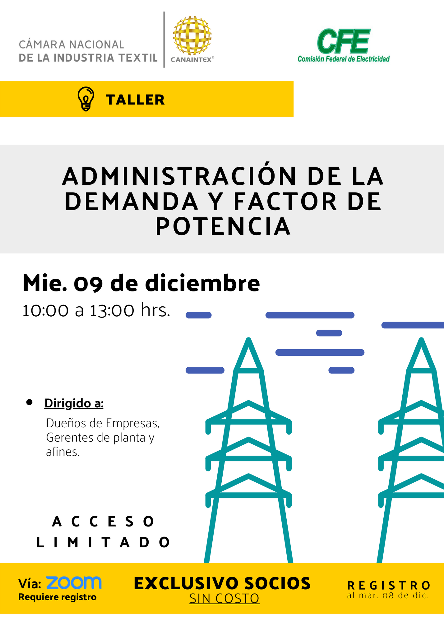 La Cámara Nacional de la Industria Textil invita a empresas socias a participar en el taller “Administración de la Demanda y Factor de potencia” impartido por CFE.